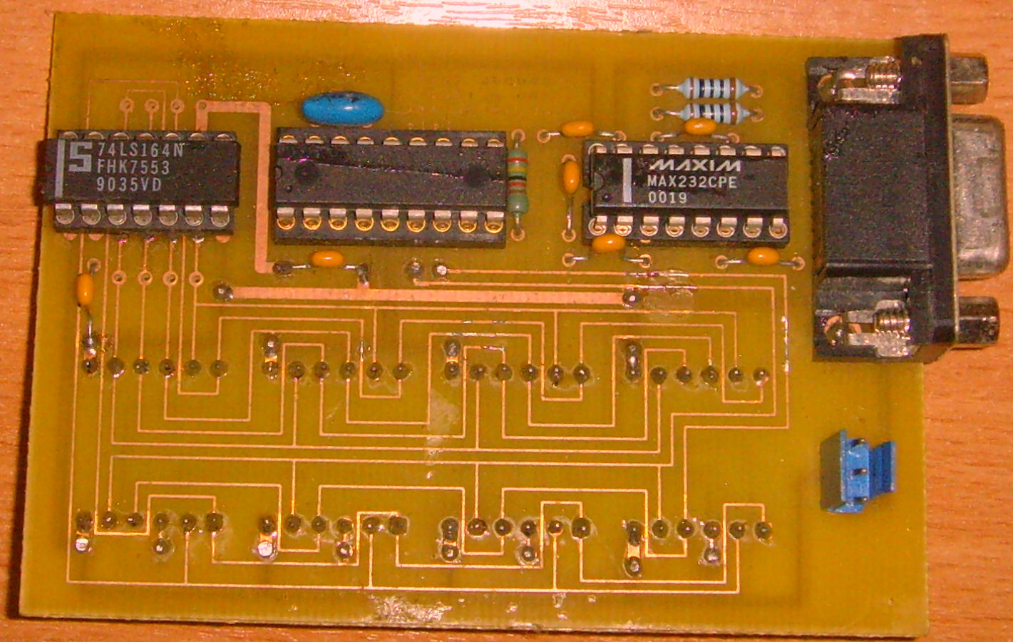 The PCB was made by printing the design onto transparency and doing UV exposure on a double sided copper board. Standard chemical etching. Trust me when I say its a PAIN to line up the two sides so the through holes meet each other!