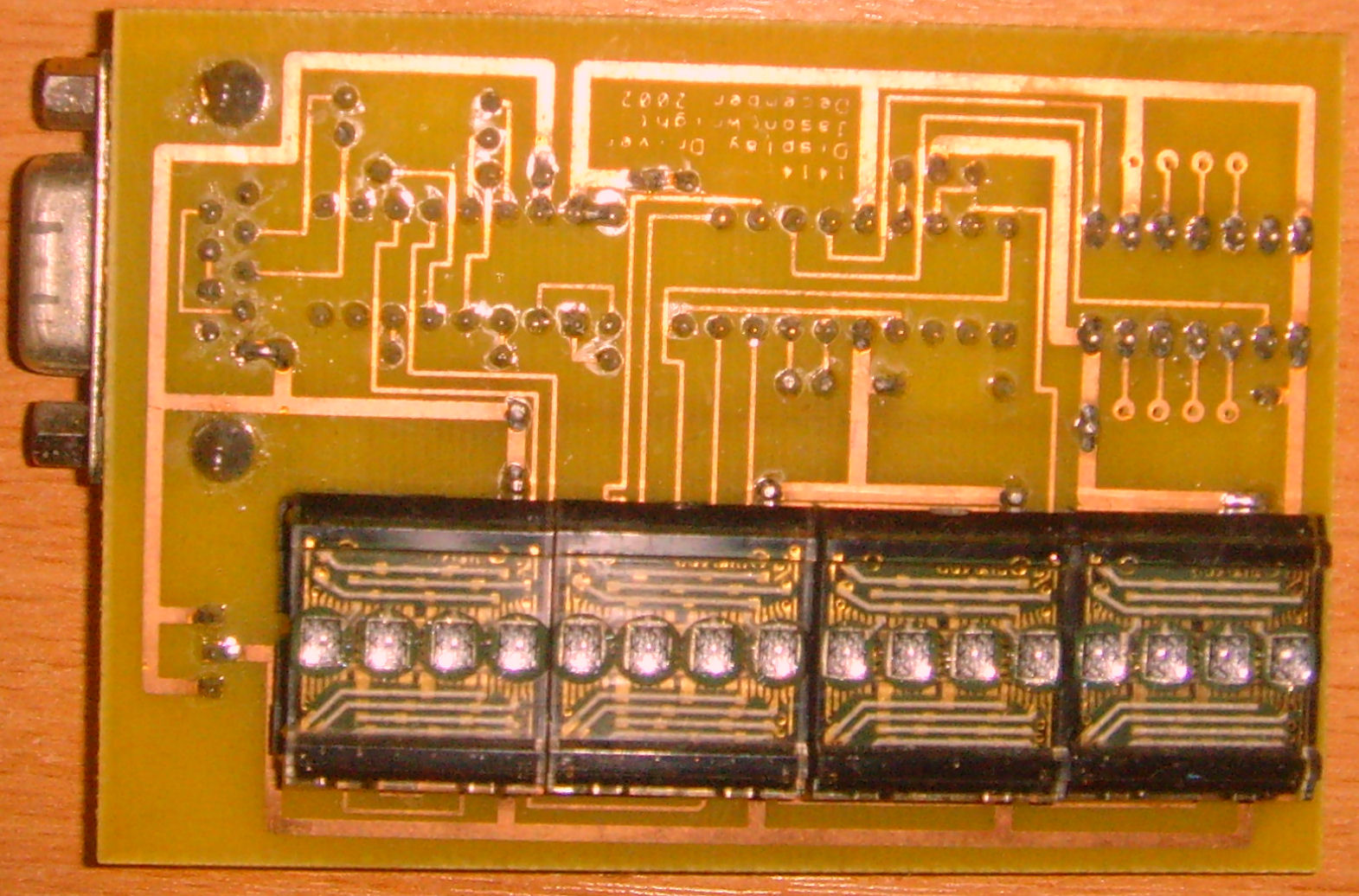 It was quite hard to make up a 2 layer PCB, but as the displays use a parallel interface there were so many connections it was needed. An RS232 driver is onboard so standard Serial can be used, the PIC translates it and displays the text on the LED display. The small 3 pin header is for power, regulated 5v. I tend to take this from a spare USB port.