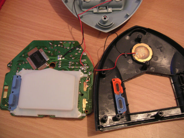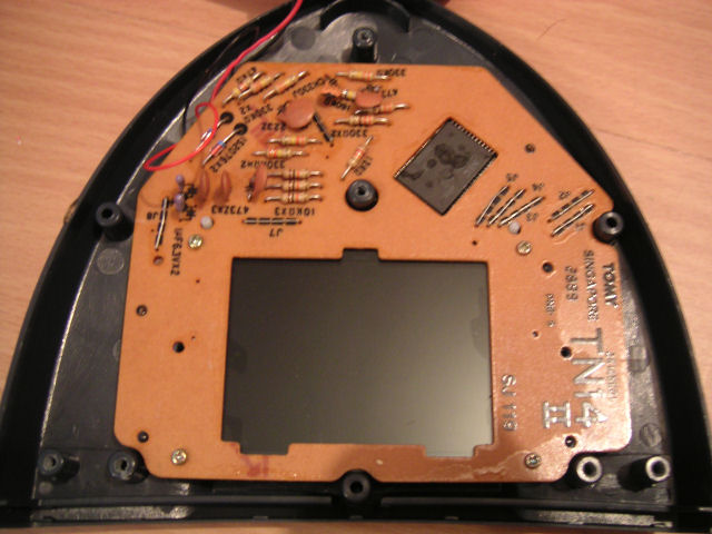 You can see from the last picture, the white plastic cover for the LCD back. This difuses the light slightly to get a reasonbly even brightness on the game screen. You cant see from here, but there is a plastic sheet over the LCD that has patches ‘coloured’ in with some kind of marker pen. This gives the game colour! Otherwise its a normal black and white LCD. Pretty much its a 3 position game&watch but the extra clever thinking that went into it made it colour and 3D.